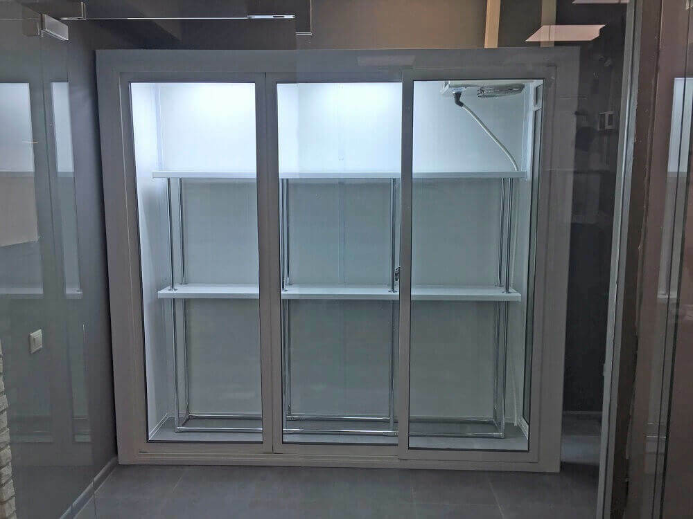 Узкая холодильная витрина для цветов чаще всего устанавливается в небольших помещениях или ограниченных площадях. При проектировании используются раздвижные двери, так как они экономят пространство при открывании и дают возможность доступа к цветам из любой точки.